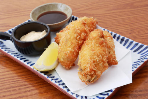 ぷっくりと大粒で甘みがあり、レモンを搾ったりオーロラソースをかけたり、タバスコをふりかけて味わうカキフライ。カキの甘味成分のグリコーゲンを含んでおり、疲労回復や脳の活性化、集中力&記憶力の向上に効果が期待できるといわれている。