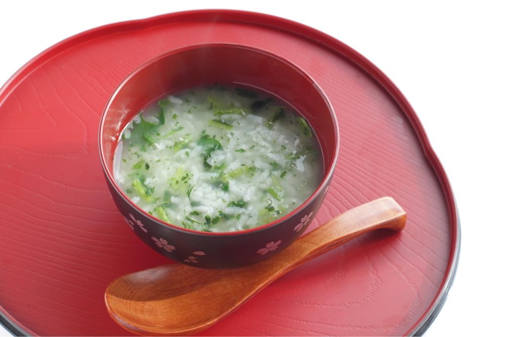 - 粥が炊き上がる5分前に、塩少々と七草を入れ混ぜ、熱々のまま器に盛っていただこう。