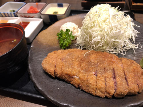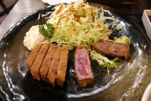 牛カツの揚げ時間は2分前後。ミディアムレア~レアに仕上げたものにワサビと醤油かタレをつけて食す。牛カツは、中身のしっとりとしてねっとりと舌に絡まるような食感と、衣のクリスピーな食感のギャップがたまらない。肉の火の通りが浅いのがウリなので、その後保存して温めなおすということができないメニューだ。