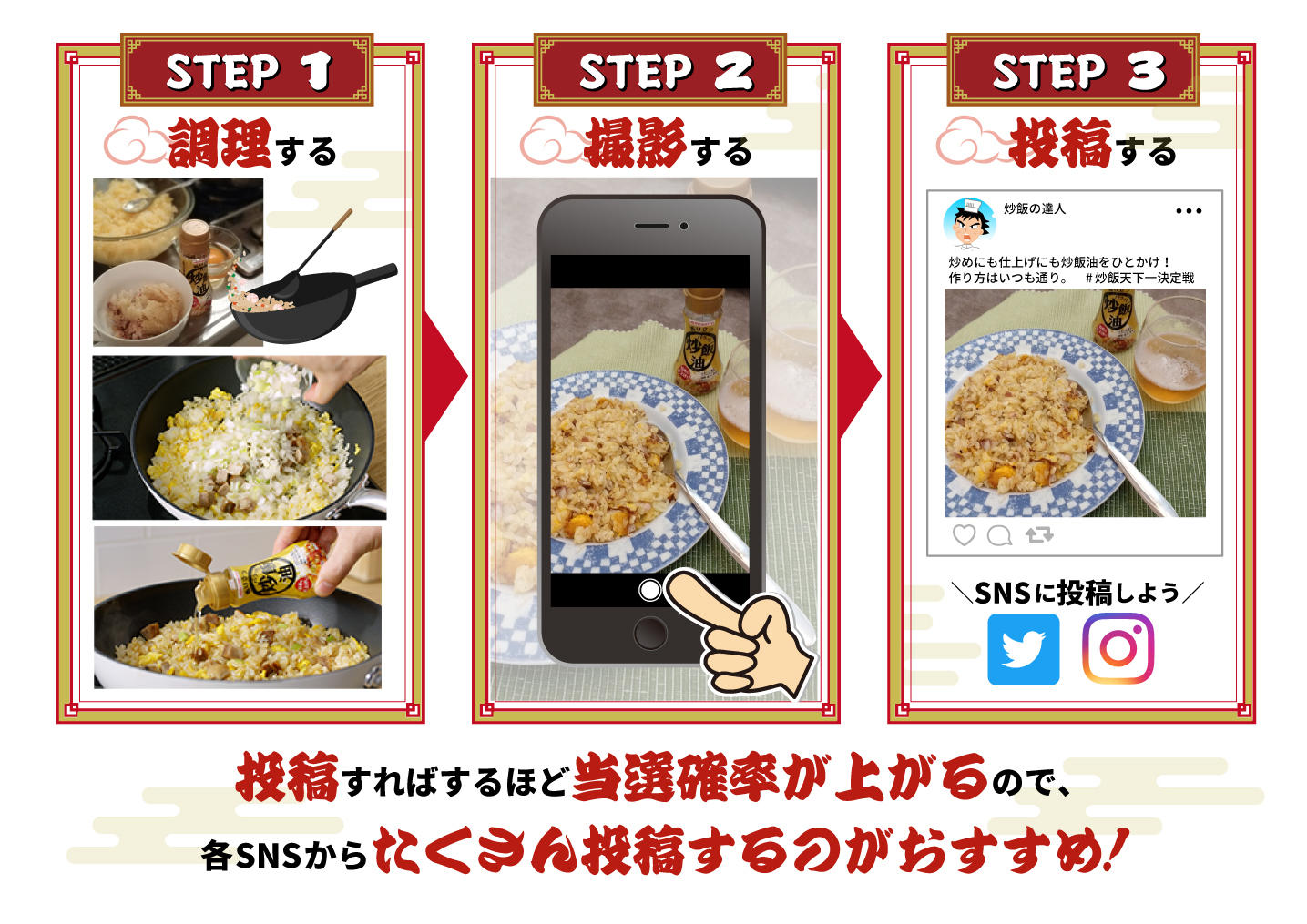TwitterとInstagramで「#炒飯天下一決定戦」のハッシュタグをつけ、写真を投稿する。料理力を遺憾なく発揮し、パラっと香り立つおいしい炒飯のレシピやこだわりポイントをアピールしてほしい。期限は2019年1月20日(日)。たくさんの応募を待っているぞ!