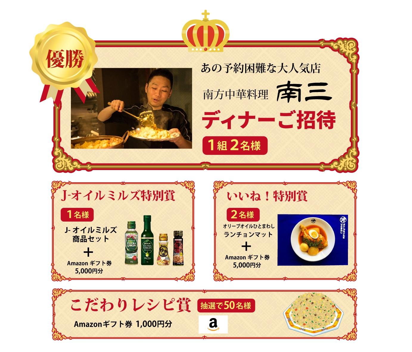「AJINOMOTO 香り立つパラッと炒飯油」を販売しているJ-オイルミルズからは、「J-オイルミルズ特別賞」が1名様に贈られる。景品としてAmazonギフト券5,000円分、さらにJ-オイルミルズの商品もプレゼント!