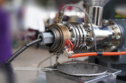 玉じめごま油を作っている精油店は、多くの工程を昔ながらの方法で行なっているところがほとんどである。まずは白ごまを精選して釜で炒るのだが、このときも薪を使って炒ることが多い。その後、ごまを細かく砕き、金輪に仕込んで蒸気に通す。ここからが玉じめ機の出番。鉄製の輪で作られた桶のようなものにごまを入れ、麻袋で包み、機械にセットする。下からの圧で桶が持ち上がり、上からぶら下がった石に押し付けられることで、ごまが絞られていく仕組みだ。絞られた油は、和紙で濾過することが多い。