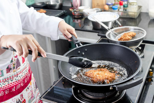 とんかつを揚げるのに、最も適しているのはフライ鍋であるが、フライパンで代用することも可能である。方法は簡単だ。フライパンに深さ1㎝くらいになるよう油を注いで熱し、焦がさないように両面にじっくり火を通していく。油が少ないため、いわゆる揚げ焼きとなるが、これでもしっかり火を通してサクサクのとんかつに仕上げることができる。衣を厚くつけてしまうと焦げやすくなるため、できるだけ薄くまぶすのがフライパンで上手に仕上げるポイントだ。