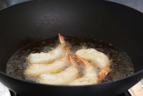 なお、使用する鍋は、ある程度深さがあり、直径の大きいものを使おう。そのほうがより多くの素材を揚げることができる。しかし、一度に大量の素材を投入すると油の温度が一気に下がり、サクサクとした食感が損なわれるおそれがある。一度に揚げる素材の量は、鍋の表面積の1/2以下にしておこう。