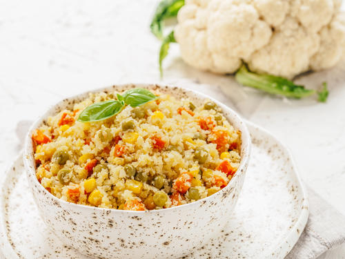 カリフラワーライスは、ライスサラダ感覚で食べるのもおすすめ。クスクスにも似た雰囲気なので、タブレ風にするとよいだろう。さいの目にした野菜とカリフラワーライスを和えて、塩胡椒とオイルで味付けをする。レモンをたっぷり絞ると、味が引き締まってより美味しい。