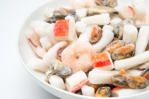 シーフード具材の冷凍ミックスは、そのまま料理に投入すると素材が縮んでしまったり、生臭さが残ったりする。これは、冷凍ミックスの製造工程に理由がある。下茹でしたシーフードを、急速冷凍の前に塩水に一度くぐらせる工程があり、これによって表面に塩水の氷膜、グレースができる。グレースは塩分を含んだ状態なので、そのまま火にかけると、浸透圧の関係でシーフード内部から水分と旨み成分が流出してしまうのだ。さらに、グレースの生臭さが料理に移ってしまうというデメリットもある。ぜひ、下ごしらえをしてから使うようにしよう。