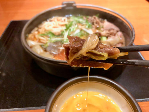 すき焼きを生卵に付けて食べる人は多く、すき焼きの美味しい食べ方として一般的だ。生卵をつけることですき焼きの味をまろやかにし、牛肉特有の臭みを和らげることもできる。また、鍋の中で熱くなっている具材に生卵を絡めることで、食べやすい温度まで冷ますこともできる。