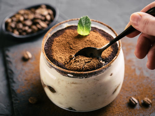 食べる直前に仕上げとしてさらにココアパウダーと粉砂糖をふりかけると、見た目にも美味しいティラミスになる。