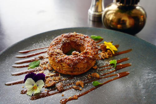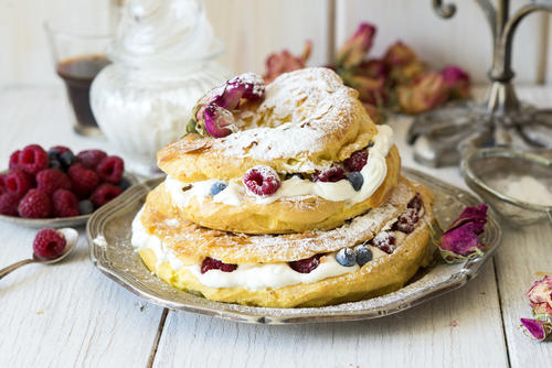 写真のパリブレストは、ホイップクリームの間にたっぷりのフランボワーズ(英=ラズベリー)をサンドしてある。ホイップクリームのカロリーの高さが気になる方は、かわりにカスタードクリームを使おう。