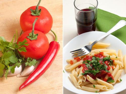ポイントはにんにくを焦がさないように注意すること。弱火でじっくり香りを引き出してみよう。辛いのが好きな人は、唐辛子を種ごと使用してもよい。生のトマトやホールのトマト缶を使う場合は、あらかじめ細かく潰しておくと煮込みやすい。