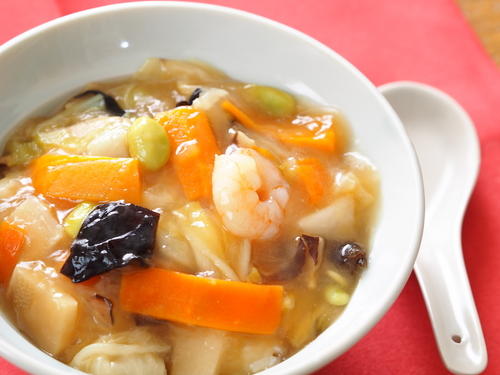 野菜炒めだけ作って冷凍しておいたものは、凍ったまま調理ができる。スープを加えて煮立たせるので、凍っていても問題ない。