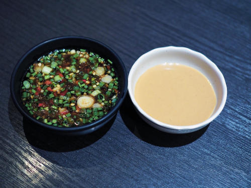 醤油ベースのポン酢のほかに、写真の右にあるような塩味のポン酢も美味しい。また、鷹の爪・ニンニク・青ネギなどを刻んでポン酢に混ぜたソースは風味が増す。お好み焼きを小さく焼いて、1枚目はあっさりとポン酢味で食べ、2枚目は定番のお好み焼きソースとマヨネーズで食べれば、違った料理を食べているかのように味の変化を楽しめる。家族でシェアするのもよいだろう。