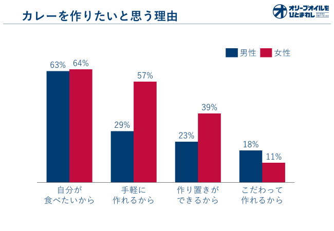 女性は「手軽に作れるから」「作りおきができるから」という便利さを多く挙げていたのに対して、男性は「こだわって作れるから」という回答が女性よりも多く集まった。家事をこなしながら家族の食事を作る必要がある主婦の方などにとっては、複数人分の食事を作り置きできるカレーが重宝されるのに対し、男性は休みの日などにこだわりのカレーを調理する場合が多い、という特徴が反映されているようだ。