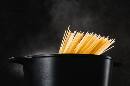 GI値とはグリセミックインデックスの略で、食後に血糖値が上昇する度合いを表す数値だ。ブドウ糖を摂取するときの血糖値の上昇の度合いを100として相対的に表している。GI値が高ければ高いほど血糖値の上昇が速くなる。するとインスリンが過剰に分泌されるので、GI値が低い食品のほうが血糖値の上昇がゆるやかになる。結果的にインスリンの分泌が抑えられるというわけだ。ちなみに、うどんの値は85、食パンは70、精白米は88だ。乾パスタは41と白米と比較してGI値が低く、主食としては太りにくい食材である。(※4)