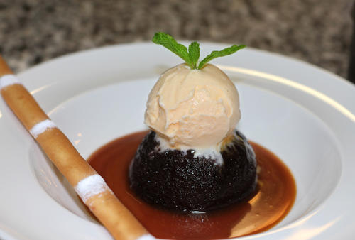 - 焼き上がったスポンジ生地に温かいソースをかけて、できあがり。カスタードクリームをかけるか、バニラアイスクリームを添えると味わいにバリエーションがつく