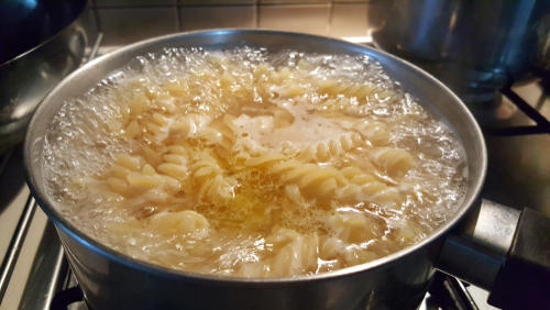 続いて、ツイストを調理する場合の下ごしらえについて見てみよう。ツイスト自体は塩を入れたお湯で茹でるだけだが、このとき気を付けるのが、なるべく口の広い鍋で、たっぷりの水で茹でることだ。これは、茹でている間にパスタ同士がくっつくのを避けるためである。