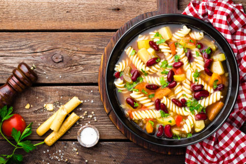 野菜をたくさん使ったヘルシーな一品。薄切りにした玉ねぎと、角切りトマト、ベーコンなどをフライパンで炒めたら、水とコンソメ、ミックスビーンズやミックスベジタブルも加えて煮込もう。そこにツイストを加えてさらに煮込み、塩・こしょうで仕上げる。あっさりとしていて食べやすいので、メインディッシュとしてはもちろん、夕食のスープ代わりや朝食にもおすすめの簡単メニューである。