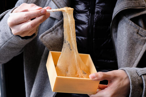 しかし、冷蔵保存したわらび餅は透明感が失われ、食感もナタデココのように固くなる。食べられないわけではないが、美味しさは欠けてしまうのだ。これはわらび餅に含まれるでんぷんの劣化が原因だ。でんぷんは加熱することで美味しく食べられる状態となる一方で、温度が下がると、固く、旨みがない状態になってしまう。でんぷんの老化現象ともいわれるこの状態を引き起こしてしまう冷蔵保存は、わらび餅の保存方法としてよいとは言えないだろう。