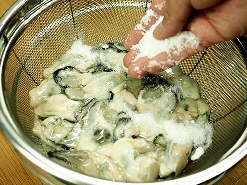 牡蠣をざるに入れ、塩(小さじ1)をかける。そして、全体に塩を行き渡らせるようなイメージで、ざるを左右に振ろう。20秒ほどすると牡蠣からアクが出るため、流水をかけて流す。牡蠣もまた、キッチンペーパーで水気をしっかりと切っておこう。