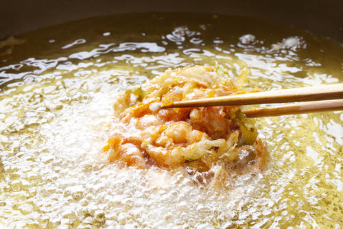 引きあげるタイミングを見極めるには、かき揚げの周囲の泡を見るのもコツだ。泡が徐々に小さくなり、かき揚げが浮いてきたら完成だ。かき揚げを油から引きあげよう。