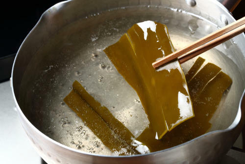 昆布出汁は、なんと昆布を水につけておくだけで、出汁が取れる。水につける前に、昆布の表面を、固く絞ったキッチンペーパーで拭いておくとよい。水で洗ってしまうと旨味成分も取れてしまうので注意が必要だ。また、小さく切り分けた昆布を使うとよい。昆布を火にかけて沸騰直前まで煮出す方法もあるが、水出しでも十分に旨みを抽出できる。出汁に使うのは、真昆布や利尻昆布、羅臼昆布などが向いていると言われるが、こちらは好みや価格との折り合いによってチョイスしたい。