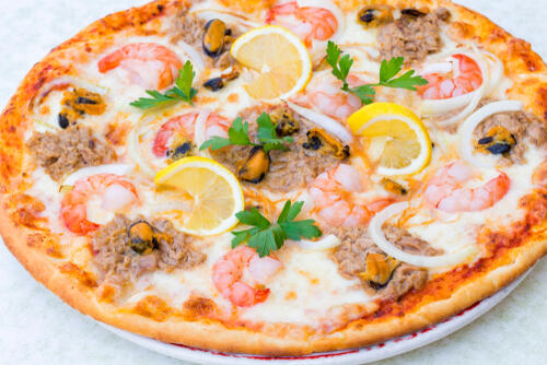 イカや貝類などにはタウリンが豊富に含まれており、タウリンは消化管内でコレステロールの吸収を抑える働きを持っている。よって、シーフードピザはカロリーが少々高めではあるが、栄養の観点からすると身体へのよい働きが期待できるピザのメニューといえるだろう。
