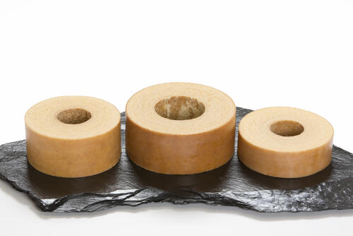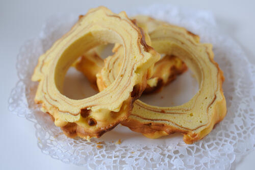バームクーヘンの円の径が小さいときにおすすめの切り方。輪切りにすると、上からチョコレートや生クリームなどトッピングしやすい。層となっている面積も大きいので、バターの香りをふんだんに楽しむことができる。