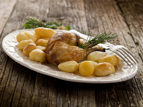ローストチキンは、鶏肉をオーブンやグリルで焼いたもの。厚手の鍋で作るレシピもある。作り方のポイントは、しっかりと塩をもみこむこと。さらにお腹の中に炒めた野菜やピラフを詰めると美味しい上に空洞が埋まり、ハリとボリューム感が生まれるので、見た目にもよい。