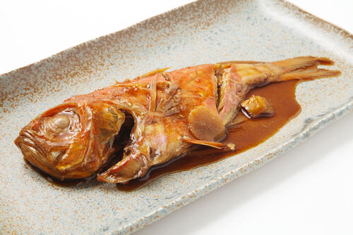 次に金目鯛の基本の料理方法をいくつか紹介しよう。最初に紹介する基本の料理方法は姿煮。鍋に醤油、みりん、砂糖、酒、塩を入れて沸騰させる。調味料がひと煮たちしたら金目鯛を投入。上から落としぶたをして弱めの中火でしっかりと中に火が通るまで煮込む。身崩れしやすいので、あまり菜箸などでいじらないことがポイント。また、火が通り過ぎると身が硬くなるので気を付けたい。続いての基本の料理方法は姿焼き。下処理をした金目鯛を丁寧に水洗いしたらキッチンペーパーなどで水気をしっかりと拭き取る。水気を拭き取ったら皮目に隠し包丁を入れ、塩をふって冷蔵庫でしばらく馴染ませておく。あらかじめ予熱したグリルやフライパンの上に鯛を置いて、両面をこんがりと焼けば完成。