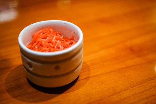 紅生姜とはひと味違った辛みを醸し出してくれるキムチ。白菜などの食感もプラスされ絶品に。酒とも相性がよい少し大人な食べ方が特徴的だ。