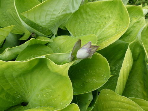 短い根茎がある植物で、葉の長さは、10~20cm、幅7~12cmで卵の形のような楕円形をしている。葉脈が横方向にも入っているのが目立つ。