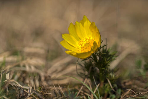 フクジュソウは、日が差し込む林の中に自生する多年草である。春の初めに、緑と茶色の間のような色の芽を出す。芽の中には、1~複数個のつぼみと若い葉が入っている。