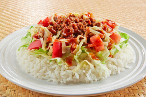 沖縄では給食にまで出されるほどに親しまれているタコライスだが、元はといえば米兵相手に手軽で安くお腹に溜まるものを提供するために作られた料理だとされている。タコスの具と同じタコミートや野菜、チーズをごはんにのせ、サルサソースをかけて食べるのが特徴で、野菜の量を増やせばボリューミーでなおかつ栄養も摂れるバランスのよい一品だ。