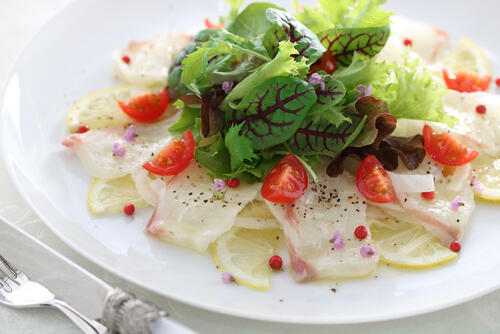 また新鮮なイサキを刺身より薄く切り、レモンを敷いたお皿のうえに盛り付ける。そのうえにベビーリーフやカットしたミニトマト、フリルレタスを立体的にトッピングし、ドレッシングをかけたら、オシャレなイサキのアレンジカルパッチョの完成である。