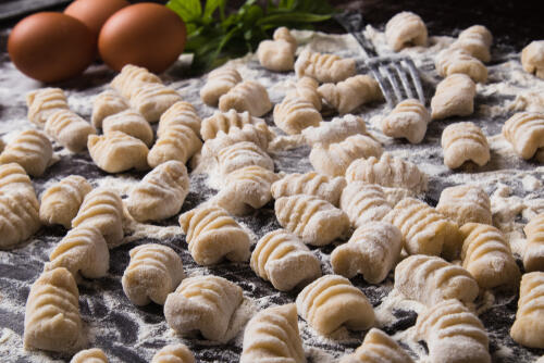 ニョッキの原材料は基本的にじゃがいもと小麦粉だ。じゃがいもには、カリウム・ビタミンB1・ビタミンCなどが含まれており、栄養豊富。通常、ビタミンCは熱によって失われるが、じゃがいもに含まれるでんぷんによる働きで、加熱しても残りやすいという特徴がある。