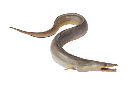 鱧はウナギ目ハモ科に属する魚で、見た目は確かにウナギやアナゴのように長くて、ぬるっとしている。大きな口と長い顎、そしてのこぎりのような歯が特徴で、なんとも獰猛な顔つきだ。夜になると活動をはじめ、イカやエビ、魚などなんでも捕まえ、その鋭い歯で噛みちぎる。体長は1m前後。大きくなると2mを越すものもあるようだ。