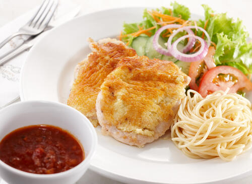 ポークピカタは塩コショウにトマトソース、あるいはケチャップをかけて食べるのが一般的だ。このあっさりとした味付けもまた、ポークピカタが低カロリーの料理となっている所以といえるだろう。