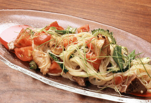 トマトに夏野菜のオクラを加えたネバネバの冷製パスタはスタミナ満点。そこにチアシードをかければプチプチ食感がプラスされ飽きのこない冷製パスタになる。