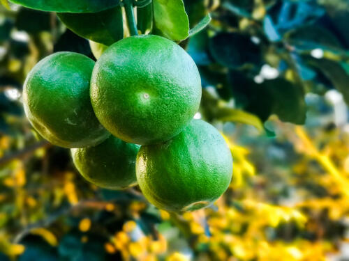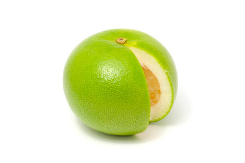 スウィーティーは緑色の果皮と黄色の果肉が特徴的な柑橘だ。大きさも形もグレープフルーツに近く球体をしているものが多いが、頭の部分が盛りあがって見えるものもある。