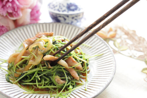 豚肉やちくわなどと一緒に、炒め合わせるのがおすすめ。豆苗は油との相性がよく、炒めることでコクのある味わいになる。シャキシャキの食感も特徴なので、強火でサッと火を通す程度にするとよい。