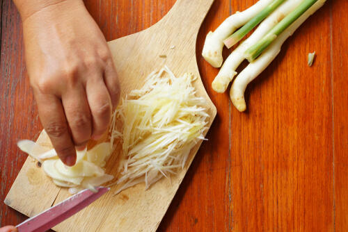 最後にアレンジをきかせた生姜ごはんのレシピを紹介しよう。ひとつめのアレンジレシピは生姜ごはんのうえに卵やむきエビ、しいたけ、青ねぎ入りのあんをかけた生姜ごはんだ。作り方は青ねぎやしいたけは薄切りにし、卵は酒と塩を加えほぐしておく。フライパンにごま油を入れみじん切りにしておいた生姜とニンニクを入れて炒め、香りが出たらエビ、しいたけ、青ねぎを加える。