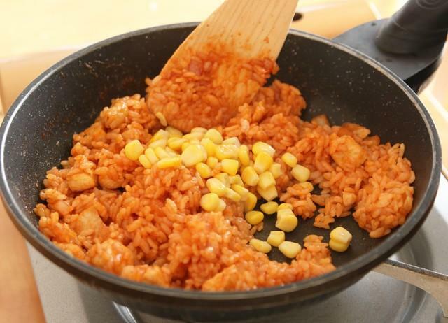 まずはケチャップライスを作る。みじん切りの玉ねぎとケチャップを耐熱ボウルに入れ、電子レンジで温める。そこにごはん、ハム、コーンを加えて混ぜる。塩コショウで味を整える。