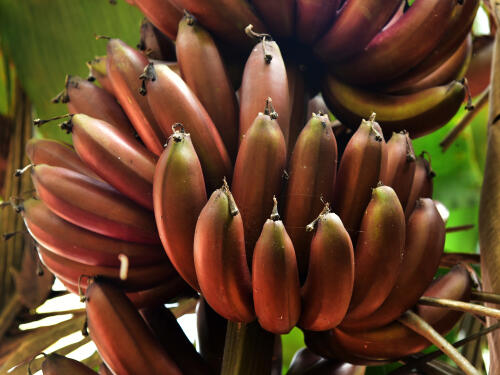 皮の色が黄色ではなく、赤色をしているレッドバナナ。レッドバナナを栽培しているフィリピンではモラードバナナ(紫のバナナ)と呼ばれており、同じくバナナの栽培が盛んな台湾では紅皮蕉(皮が赤いバナナ)や、蘋果蕉(リンゴバナナ)といった愛称で呼ばれている。どの国でも「バナナ=黄色」というイメージが強いせいか、赤や紫といった色に関する異名をつけられていることが分かる。