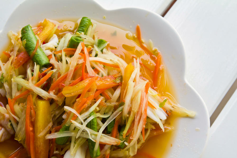 青パパイヤを食べる習慣が根づいているタイでは、青パパイヤをサラダの具材として使うことが多い。なかでも「ソムタム」と呼ばれるタイ風のサラダ料理は、細かく刻んだ青パパイヤのほかに、干しエビやミニトマト、唐辛子、茹でたインゲンマメなどを混ぜて、レモン汁やナンプラーで味付けするだけでできるので、非常におすすめだ。