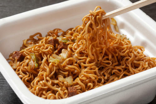 シーフードのカップラーメンを表示時間通りに熱湯を注いで戻す。