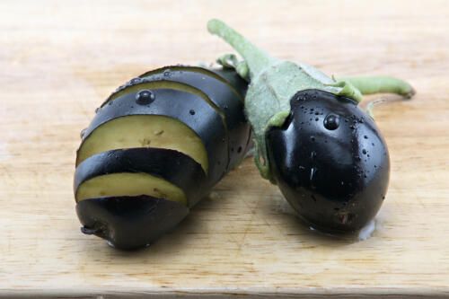 - 小なすは水洗いし、トゲのあるガクの部分を切り取る。縦に数本切り込みを入れ、水にさらしてアクをとる。