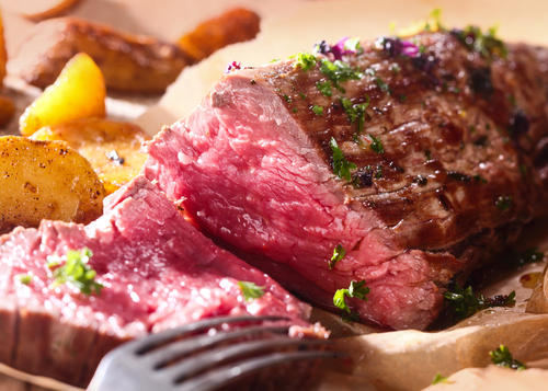 ステーキはヒレやサーロインなどが使われる。一枚ずつ焼くのが基本である。対してローストビーフと牛たたきは塊肉で調理するのが基本。ももやランプが中心だ。