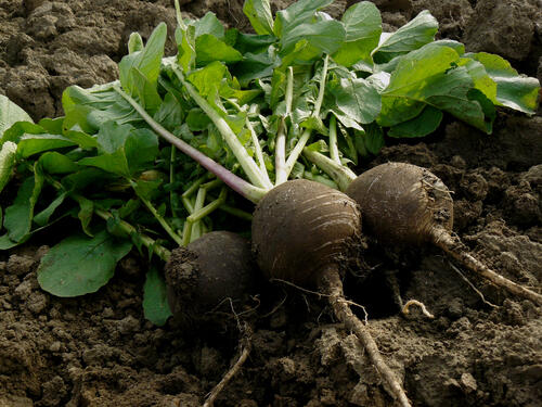 黒大根には一般的な青首大根と同じような形の黒長大根と、かぶのような形の黒丸大根がある。味は大きく違わないが、黒丸大根のほうがややかためである。