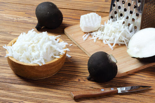 黒大根は辛みが強いが、日本の辛み大根ほどではなく、ほどよいアクセントとなるのでサラダなどの生食にも使われる。表皮の黒色と中の白色のコントラストが美しいので、薄くスライスして食べるとよいだろう。日本の赤大根と合わせることで、さらに彩りがよくなる。
