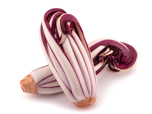 紫と白のコントラストが美しい葉は、一般的なチコリー(ベルギーチコリー)よりも細長く、結球はせずに先が内側に巻き込むような形になる。味は、やさしいほろ苦さと甘みのバランスがよいのが特徴だ。